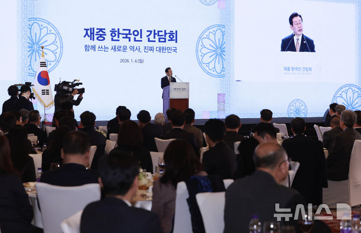 [베이징=뉴시스] 최동준 기자 = 중국을 국빈 방문 중인 이재명 대통령이 4일(현지 시간) 베이징의 한 호텔에서 열린 재중 한국인 간담회에서 인사말을 하고 있다. 2026.01.04. [email protected]