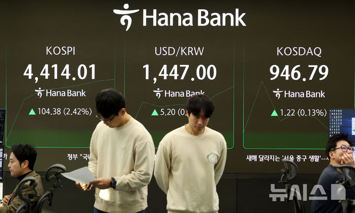 코스닥 지수는 전 거래일(945.57) 보다 2.99포인트(0.32%) 오른 948.56, 서울 외환시장에서 원·달러 환율은 전 거래일 주간거래 종가(1441.8)보다 1.9원 오른 1443.7원에 출발했다. 2026.01.05. [email protected]