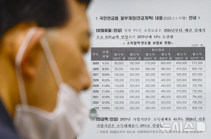 올해부터 국민연금법 개정에 따라 내년 국민연금 보험료율이 월 소득의 9%에서 9.5%로 올랐다. 보험료율이 9.5%로 조정되면서 월 평균소득이 309만원인 직장 가입자는 종전보다 7700원 늘어난 14만6700원을 매월 납부해야 한다. 지역가입자는 본인이 보험료율을 전액 납부하므로 보험료가 기존보다 1만5400원 오른다. 2026.01.05. [email protected]