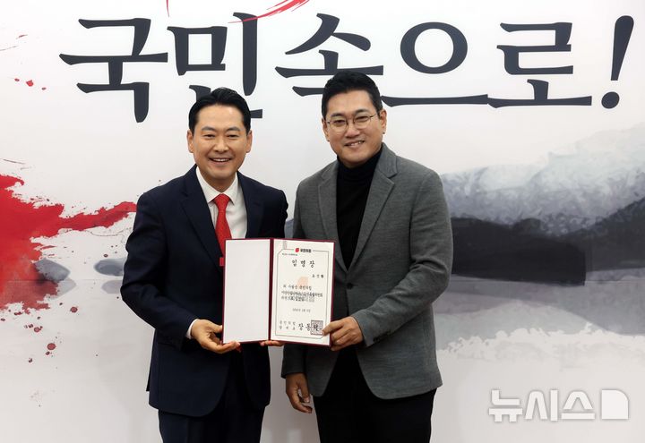 [서울=뉴시스] 조성봉 기자 = 장동혁 국민의힘 대표가 5일 오전 서울 여의도 국회에서 열린 야당탄압가짜뉴스감시특별위원회 임명장 수여식 및 제1차 전체회의에서 오신환 위원에게 임명장을 수여하고 기념촬영을 하고 있다. 2026.01.05. [email protected]