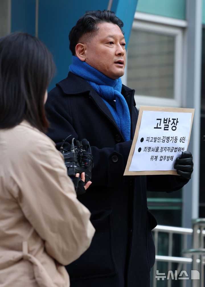 [서울=뉴시스] 이영환 기자 = 김한메 사법정의바로세우기시민행동 대표가 5일 오전 서울 종로구 서울경찰청 민원봉사실 앞에서 김병기 더불어민주당 의원과 김현지 청와대 제1부속실장 등 6인에 대한 뇌물, 정치자금법위반 위계 업무방해 혐의 고발 기자회견을 하고 있다. 2026.01.05. [email protected]