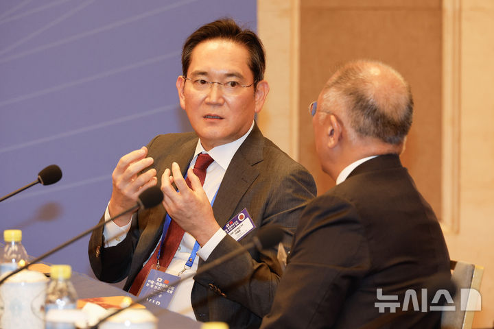 [베이징=뉴시스] 최동준 기자 = 이재용 삼성전자 회장과 정의선 현대차그룹 회장이 5일(현지 시간) 베이징 조어대에서 열린 한중 비즈니스 포럼 사전 간담회에서 대화를 나누고 있다. 2026.01.05. [email protected]