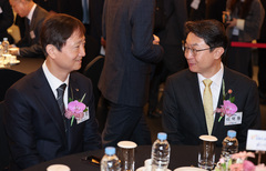 [베이징=뉴시스] 최동준 기자 = 이재용 삼성전자 회장과 정의선 현대차그룹 회장이 5일(현지 시간) 베이징 조어대에서 열린 한중 비즈니스 포럼 사전 간담회에서 대화를 나누고 있다. 2026.01.05. [email protected]