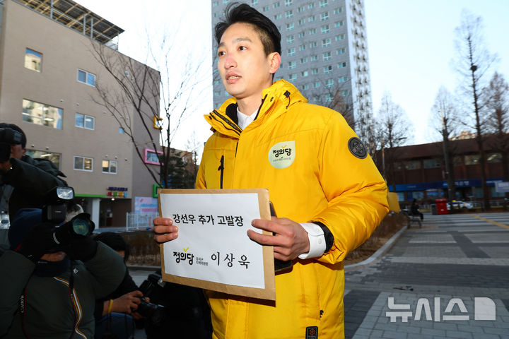 [서울=뉴시스] 황준선 기자 = 강선우 무소속(전 더불어민주당) 의원을 공직선거법 위반 혐의로 고발한 이상욱 정의당 강서구 위원장이 5일 오후 서울 강서경찰서에서 열린 고발인 조사 출석 및 추가 고발을 하기 위해 이동하고 있다. 2026.01.05. [email protected]