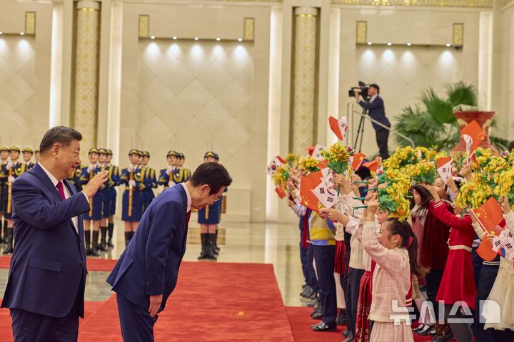 [베이징=뉴시스] 최동준 기자 = 중국을 국빈 방문 중인 이재명 대통령이 5일(현지 시간) 베이징 인민대회당에서 열린 공식환영식에서 시진핑 국가주석과 이동하며 환영 나온 어린이들에게 인사하고 있다. (공동취재) 2026.01.05. [email protected]
