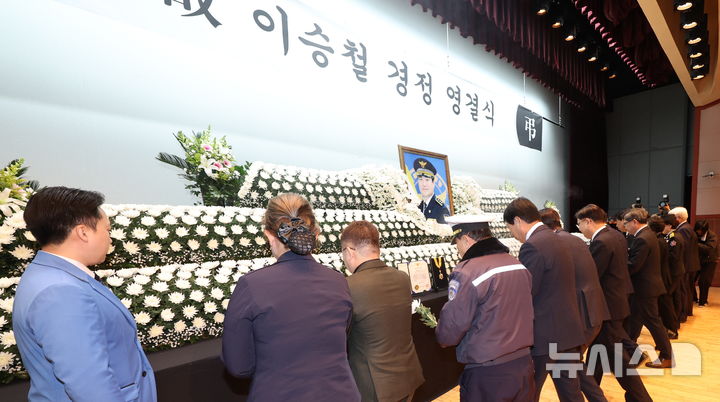 [전주=뉴시스] 김얼 기자 = 고속도로 교통사고 정리 중 2차 사고로 순직한 故 이승철 경감의 영결식이 치러진 6일 전북 전주시 전북경찰청에서 관계자들이 헌화를 하고 있다. 2026.01.06. [email protected]