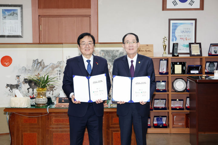 [광주=뉴시스] 문인(왼쪽) 광주 북구청장과 최순모 (사)대한주차산업협회 중앙회장이 6일 오후 광주 북구청사에서 '태양광 발전설비 무상 설치 업무 협약'을 체결한 뒤 기념사진을 촬영하고 있다. (사진 = 광주 북구 제공) 2026.01.06. [email protected]