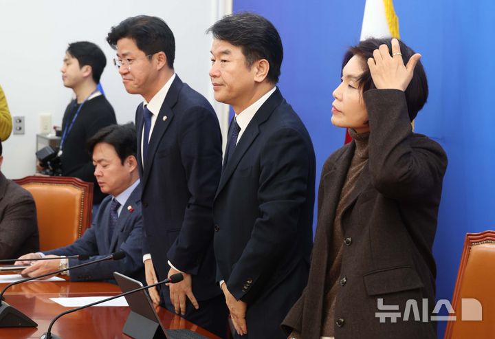 [서울=뉴시스] 조성봉 기자 = 문진석 더불어민주당 원내대표 직무대행과 원내지도부가 6일 오전 서울 여의도 국회에서 열린 원내대책회의에서 굳은 표정을 짓고 있다. 2026.01.06. [email protected]