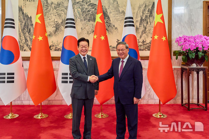 [베이징=뉴시스] 최동준 기자 = 중국을 국빈 방문 중인 이재명 대통령이 6일(현지 시간) 베이징 조어대에서 리창 국무원 총리를 만나 기념촬영을 하고 있다. (공동취재) 2026.01.06. [email protected]