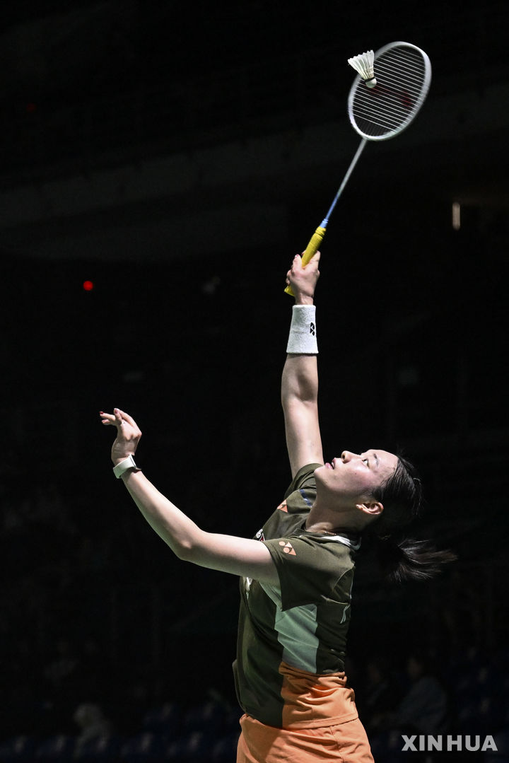 [쿠알라룸푸르=신화/뉴시스] 김가은(16위)이 6일(현지 시간) 말레이시아 쿠알라룸푸르 악시아타 아레나에서 열린 2026 세계배드민턴연맹(BWF) 월드투어 슈퍼1000 말레이시아 오픈 여자 단식 1회전(32강)에서 한웨(5위·중국)와 경기하고 있다. 김가은이 0-2(16-21 10-21)로 완패했다. 2026.01.07.