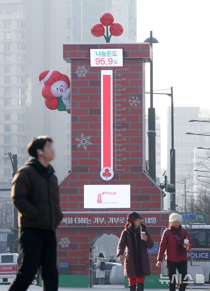 [서울=뉴시스] 김선웅 기자 = 7일 오전 서울 종로구 광화문광장에 설치된 사랑의 온도탑 나눔온도가 95.9도를 기록하고 있다. 사랑의열매 사회복지공동모금회의 '희망2026나눔캠페인' 목표 모금액은 4500억원으로, 금액 1%는 사랑의 온도탑 1도와 같으며 모금 기간은 오는 31일까지다. 2026.01.07. [email protected]
