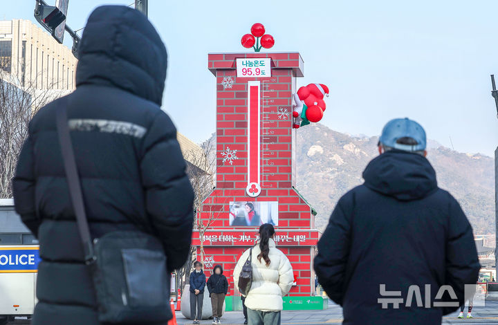 [서울=뉴시스] 김선웅 기자 = 7일 오전 서울 종로구 광화문광장에 설치된 사랑의 온도탑 나눔온도가 95.9도를 기록하고 있다. 사랑의열매 사회복지공동모금회의 '희망2026나눔캠페인' 목표 모금액은 4500억원으로, 금액 1%는 사랑의 온도탑 1도와 같으며 모금 기간은 오는 31일까지다. 2026.01.07. [email protected]