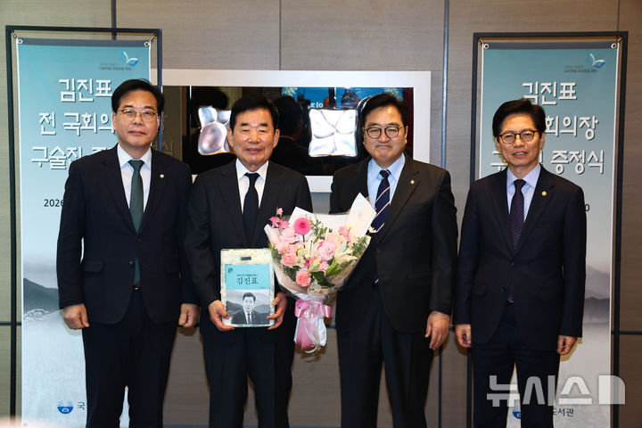 [서울=뉴시스] 김명년 기자 = 우원식(왼쪽 세 번째) 국회의장이 7일 서울 여의도 한 호텔에서 김진표(왼쪽 두 번째) 전 국회의장에게 구술집을 증정한 뒤 송언석 국민의힘 원내대표 등과 함께 기념촬영하고 있다. 2026.01.07. [email protected]