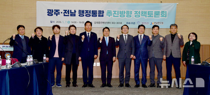 [광주=뉴시스] 류형근 기자 = 7일 오후 광주 서구 김대중컨벤션센터 3층에서 광주·전남 행정통합 추진방향 정책토론회가 열리기 앞서 강기정 광주시장 등 참석자들이 기념 촬영을 하고 있다. 2026.01.07. [email protected]