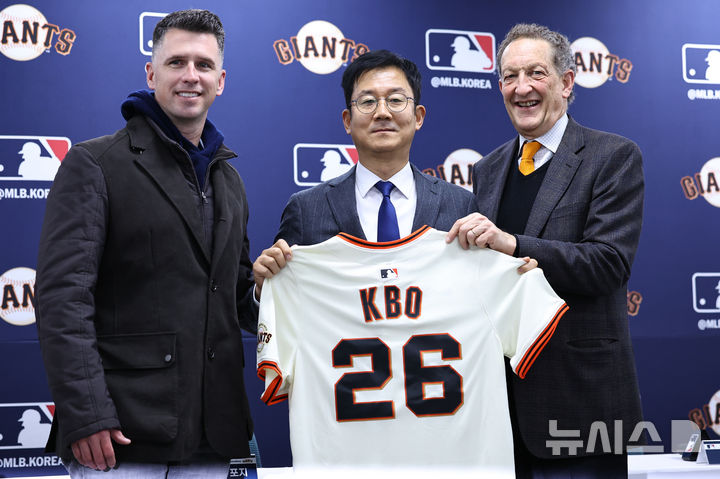 [이천=뉴시스] 최진석 기자 = 래리 베어 샌프란시스코 자이언츠 CEO와 버스터 포지 사장이 7일 오후 경기 이천 LG 챔피언스파크에서 열린 샌프란시스코 자이언츠 공식 기자회견에서 박근찬 KBO 사무총장에게 유니폼을 전달하며 기념촬영하고 있다. 2026.01.07. [email protected]