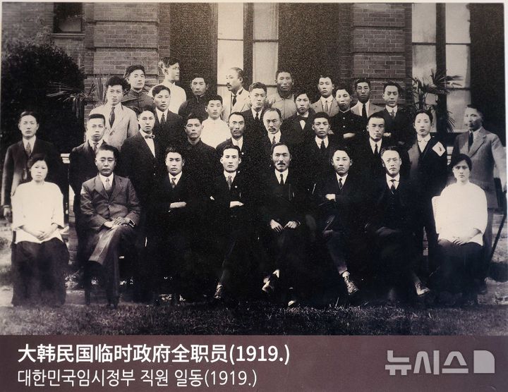 [상하이=뉴시스] 최동준 기자 = 중국을 국빈 방문 중인 이재명 대통령과 김혜경 여사가 7일(현지 시간) 상하이 임시정부청사 기념관에서 열린 대한민국 임시정부 상하이 청사 100주년 기념식에 참석한 가운데 1919년 당시 대한민국 임시정부 직원 단체사진이 걸려있는 모습. 2026.01.07. [email protected]