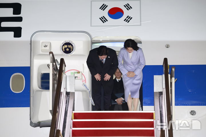 [성남=뉴시스] 최동준 기자 = 중국 국빈 방문 일정을 마친 이재명 대통령과 김혜경 여사가 7일 경기 성남 서울공항에 도착해 공군 1호기에서 내리며 인사하고 있다. 2026.01.07. [email protected]