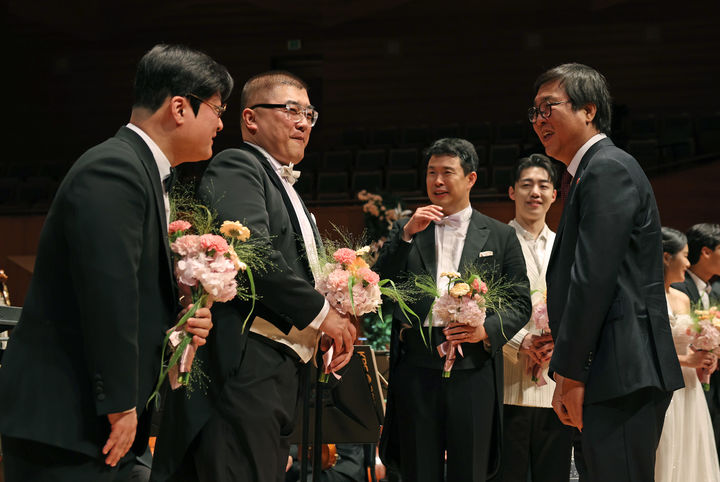 [서울=뉴시스] 최휘영 문화체육관광부 장관이 7일 서울 서초구 예술의전당 음악당 콘서트홀에서 열린 2026 신년음악회를 마치고 출연진을 격려하고 있다. (사진=문화체육관광부 제공). 2026.01.07. [email protected] *재판매 및 DB 금지