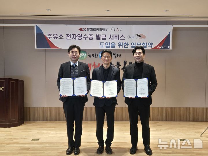 [진천=뉴시스] 김영곤(왼쪽) 충북휴게소장단 회장과 김석규(왼쪽 두 번째) 한국도로공사 충북본부 관리처장, 손종희 주식회사 더리얼 대표가 8일 진천군 진천읍 한국도로공사 충북본부 회의실에서 고속도로 주유소 전자영수증 서비스 도입을 위한 업무협약을 한 뒤 기념촬영을 하고 있다. 전자영수증 서비스는 주유기에 부착된 NFC패드에 휴대전화를 태그하면 전자영수증을 발급하는 방식으로 자원 절약과 온실가스 감축 효과를 기대할 수 있다. (사진=한국도로공사 충북본부 제공) 2026.01.08. [email protected]