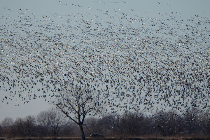 [마운드시티=AP/뉴시스] 7일(현지 시간) 미 미주리주 마운드시티 인근 로이스 블러프스 국립야생동물보호구역 연못 상공에 흰기러기들이 떼 지어 날아오르고 있다. 2026.01.08.