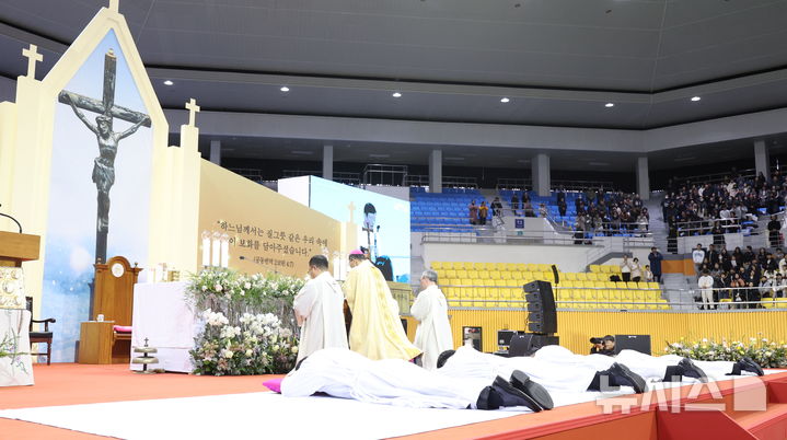 [익산=뉴시스] 김얼 기자 = 2026년 천주교 전주교구 사제·부제 서품식이 열린 8일 전북 익산시 익산실내체육관에서 서품을 받게 된 사제와 부제들이 부복예식을 하고 있다. (전북사진기자단 공동취재) 2026.01.08. [email protected]