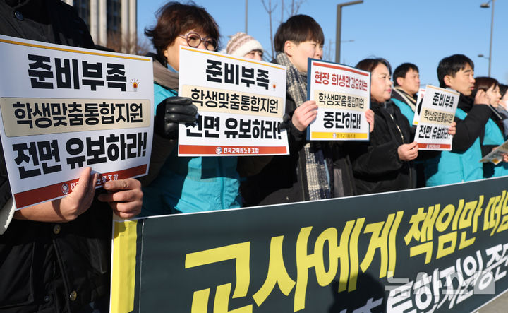 [서울=뉴시스] 추상철 기자 = 전국교직원노동조합이 8일 오전 서울 종로구 정부서울청사 앞에서 '학생맞춤통합지원법 3월 전면시행 중단 촉구' 기자회견을 하고 있다. 2026.01.08. [email protected]