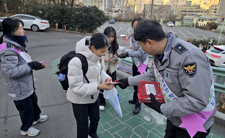 [광주=뉴시스] 류형근 기자 = 광주 남부경찰서와 자치경찰위원회가 8일 오전 광주 남구 동아여자중학교에서 졸업식 이후 발생할 수 있는 폭력·도박·약물 등 청소년 일탈 예방을 위한 홍보 활동을 하고 있다. (사진=광주 남부경찰서 제공). 2026.01.08. [email protected] *재판매 및 DB 금지