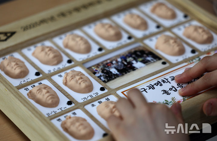 [대구=뉴시스] 이무열 기자 = 8일 대구 남구 시각장애 학생을 위한 교육기관인 대구광명학교에서 열린 2025학년도 졸업식에서 졸업생들이 3D 프린터로 제작된 졸업앨범 속 친구 얼굴을 손끝으로 만져보고 있다. 2026.01.08. [email protected]