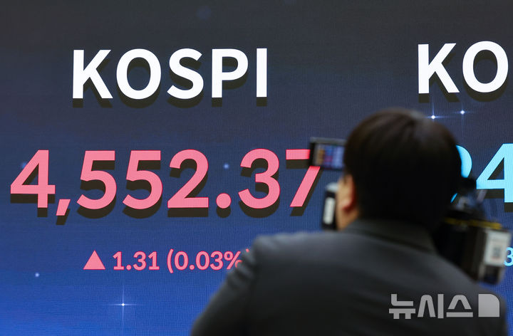 [서울=뉴시스] 황준선 기자 = 코스피가 전 거래일(4551.06)보다 1.31포인트(0.03%) 오른 4552.37에 거래를 마감한 8일 오후 서울 여의도 한국거래소 서울사무소 홍보관에 지수가 표시돼 있다. 코스닥 지수는 전 거래일(947.39)보다 3.33포인트(0.35%) 하락한 944.06에 거래를 마쳤다. 2026.01.08. [email protected]