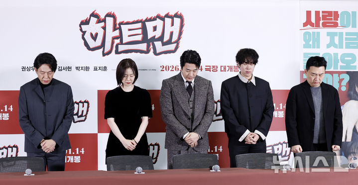 [서울=뉴시스] 김혜진 기자 = 배우 박지환(왼족부터), 문채원, 권상우, 표지훈, 최원섭 감독이 8일 오후 서울 송파구 롯데시네마 월드타워점에서 열린 영화 '하트맨'(감독 최원섭) 언론시사회에 앞서 故 안성기를 추모하는 묵념을 하고 있다. 2026.01.08. [email protected]