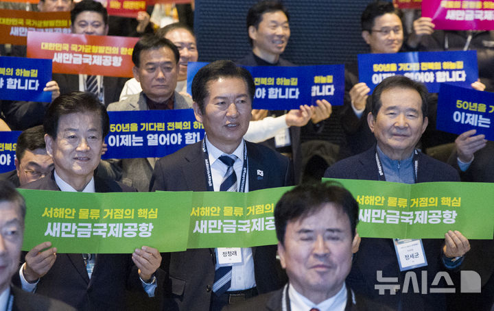 [서울=뉴시스] 김근수 기자 = 정동영(왼쪽부터) 통일부 장관과 정청래 더불어민주당 당대표, 정세균 전 국무총리가 8일 서울 중구 더플라자 호텔에서 열린 2026 전북특별자치도민회중앙회 신년인사회에서 플래카드를 들고 기념촬영을 하고 있다. 2026.01.08. [email protected]