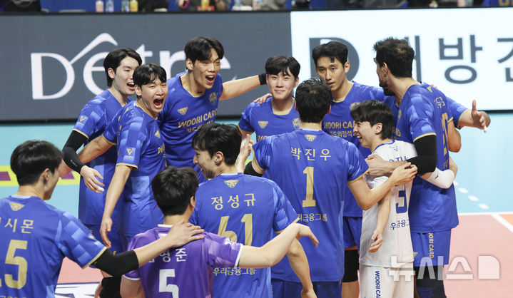 [서울=뉴시스] 김근수 기자 = 8일 오후 서울 중구 장충체육관에서 열린 진에어 2025-26 V-리그 프로배구대회 우리카드와 대한항공의 경기에서 우리카드가 세트 스코어 3-0으로 승리를 거두자 선수들이 기뻐하고 있다. 2026.01.08. [email protected]