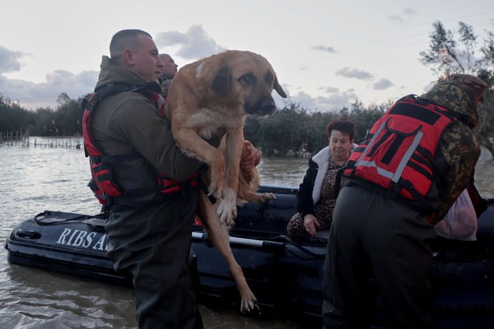 [페라스=AP/뉴시스] 8일(현지 시간) 알바니아 페라스에서 홍수가 발생해 민방위대원들이 개를 구조하고 있다. 알바니아 서남부 지역에서 폭우로 인한 홍수가 발생해 공무원 1명이 숨지고 주민들이 대피했다. 발칸 지역은 지난 일요일부터 폭설·폭우가 이어져 도로·철도 운행이 중단되고 정전, 단수 등 피해가 발생했다. 2026.01.09.