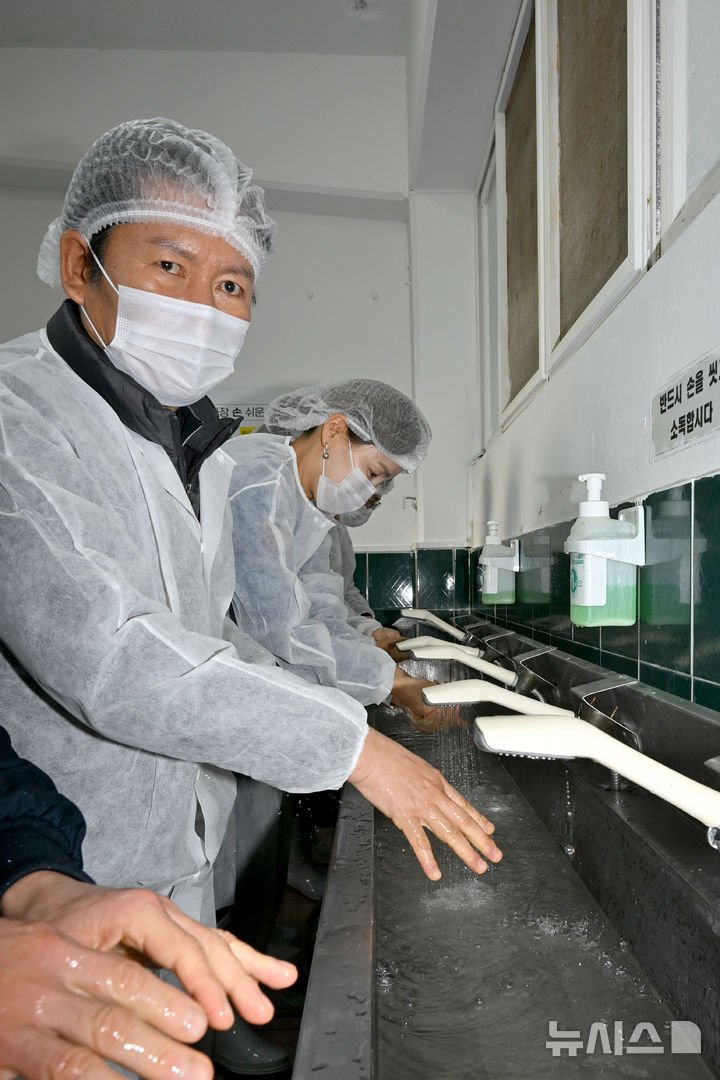 [거제=뉴시스] 차용현 기자 = 9일 오후 더불어민주당 정청래 대표가 경남 거제시 하청면 소재 대일수산을 찾아 굴을 까는 박신작업에 앞서 손을 씻고 있다. 2026.01.09. [email protected]