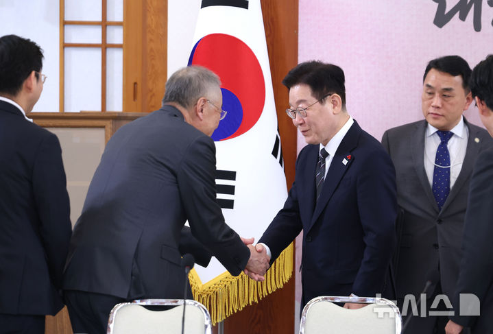 [서울=뉴시스] 최동준 기자 = 이재명 대통령이 9일 청와대에서 열린 경제성장전략 국민보고회에서 류진 한국경제인협회 회장과 인사를 나누고 있다. (청와대통신사진기자단) 2026.01.09. [email protected]