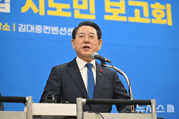 [광주=뉴시스] 이영주 기자 = 김영록 전남도지사가 9일 오후 광주 서구 김대중컨벤션센터에서 열린 광주·전남 행정통합 시도민 보고회에 참석해 발표하고 있다. 2026.01.09. [email protected]