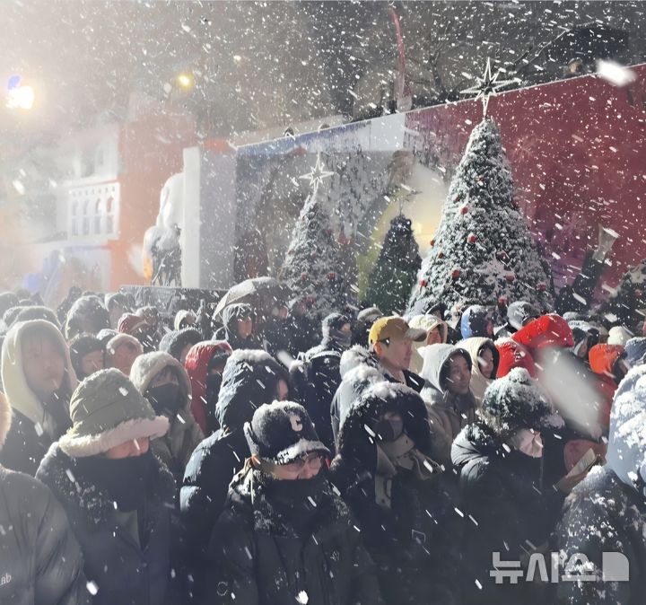 [화천=뉴시스]서백 기자= 10일 눈이.내리는 화천산천어축제 개막식장에 참석한 수많은 관광객들이 개막 공연을 보며 즐거워하고 있다.2026.1.10. [email protected]