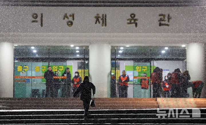 [의성=뉴시스] 이무열 기자 = 10일 오후 3시 14분께 경북 의성군 비봉리 야산에서 발생한 불로 인해 인근 주민들이 대피한 의성체육관에 눈이 내리고 있다.