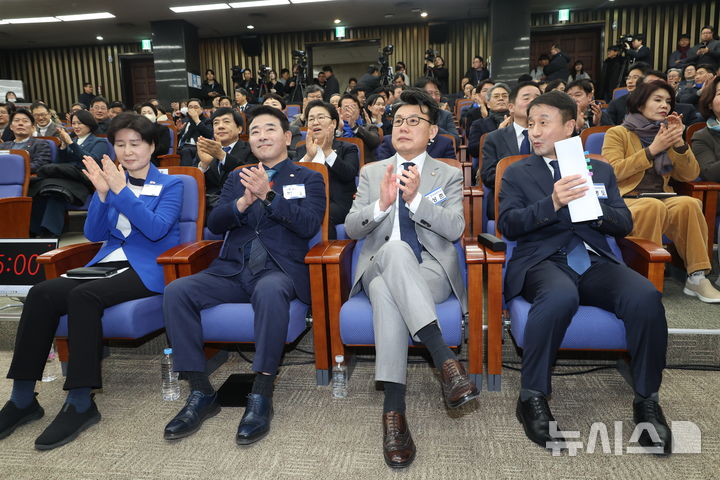 [서울=뉴시스] 조성봉 기자 = 한병도(오른쪽부터), 진성준, 박정, 백혜련 더불어민주당 원내대표 후보자들이 11일 오후 서울 여의도 국회에서 열린 제22대 국회 더불어민주당 제2기 원내대표 선출 의원총회에서 박수를 치고 있다. [email protected]
