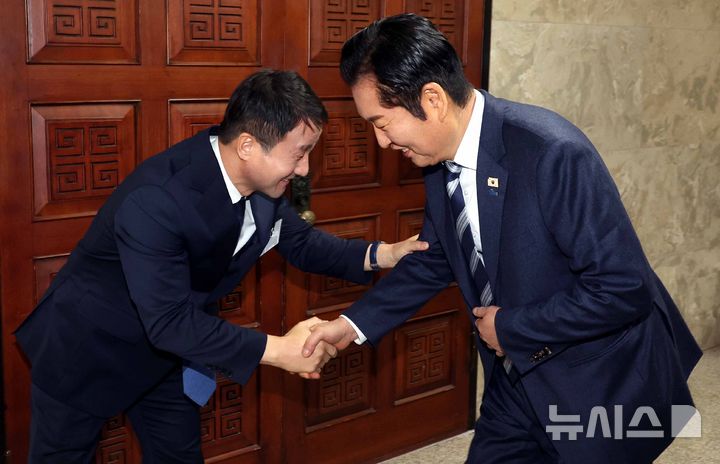 [서울=뉴시스] 조성봉 기자 = 정청래 더불어민주당 대표가 11일 오후 서울 여의도 국회에서 열린 제22대 국회 더불어민주당 제2기 원내대표 선출 의원총회에서 한병도 후보와 악수를 하고 있다. 2026.01.11. [email protected]