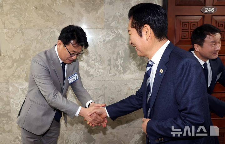 [서울=뉴시스] 조성봉 기자 = 정청래 더불어민주당 대표가 11일 오후 서울 여의도 국회에서 열린 제22대 국회 더불어민주당 제2기 원내대표 선출 의원총회에서 진성준 후보와 악수를 하고 있다. 2026.01.11. [email protected]