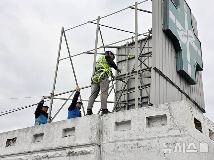 [광주=뉴시스] 광주 북구 안전총괄과 직원과 옥회광고협회원들이 12일 오전 광주 북구 풍향동 한 건물 옥상에서 강풍으로 인한 간판 안전사고 예방을 위해 안전점검을 실시하고 있다. (사진 = 광주 북구 제공) 2026.01.12. [email protected]