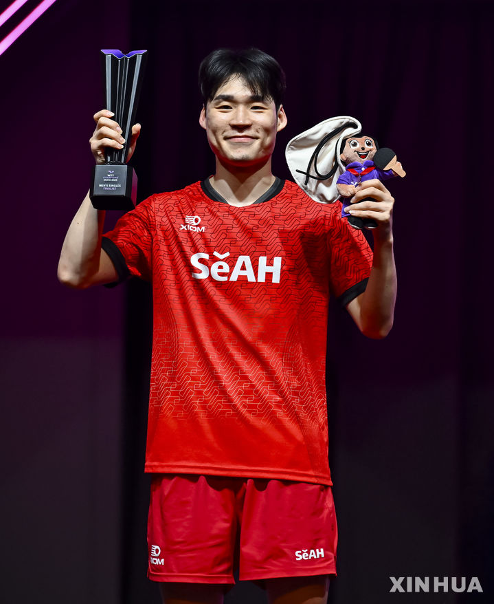 [도하=신화/뉴시스] 장우진(18위)이 11일(현지 시간) 카타르 도하에서 열린 월드테이블테니스(WTT) 챔피언스 도하 2026 남자 단식 준우승을 차지해 트로피를 들고 포즈를 취하고 있다. 준결승에서 세계 2위 린스둥(중국)을 꺾고 올라온 장우진은 결승에서 대만 간판 린윈루(13위·대만)에게 0-4(7-11 9-11 9-11 11-13)로 완패해 준우승을 차지했다. 2026.01.12.
