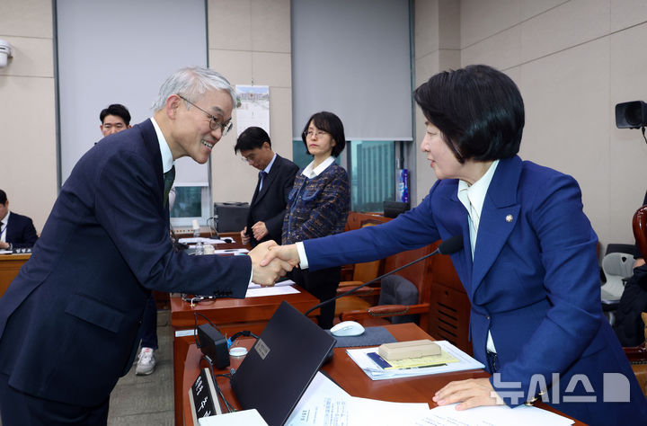 [서울=뉴시스] 김금보 기자 = 추미애 국회 법제사법위원장이 12일 서울 여의도 국회에서 열린 법제사법위원회 전체회의에서 12·3 계엄 의혹 관련 후속 수사를 위한 2차 종합 특검법을 여당 주도로 통과 시킨 뒤 천대엽 법원행정처장과 인사를 나누고 있다. 2026.01.12. [email protected]