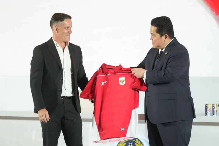 [자카르타=AP/뉴시스] 존 허드먼(왼쪽) 인도네시아 축구대표팀 신임 감독이 13일(현지 시간) 자카르타에서 열린 기자회견에서 에릭 토히르 인도네시아축구협회(PSSI) 회장에게서 대표팀 유니폼을 받고 있다. 2026.01.13.