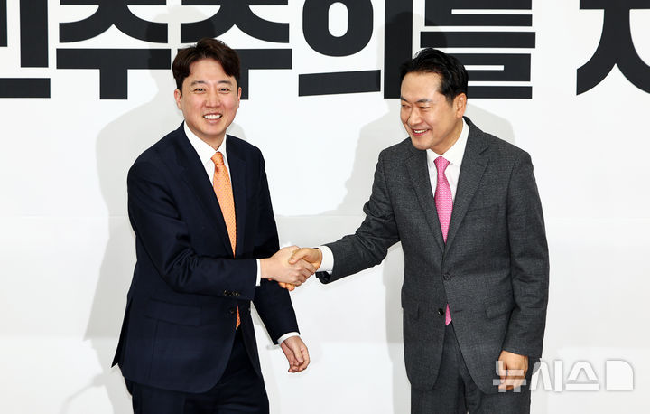 [서울=뉴시스] 김명년 기자 = 장동혁(오른쪽) 국민의힘 대표와 이준석 개혁신당 대표가 13일 오전 서울 여의도 국회에서 만나 악수하고 있다. 2026.01.13. [email protected]