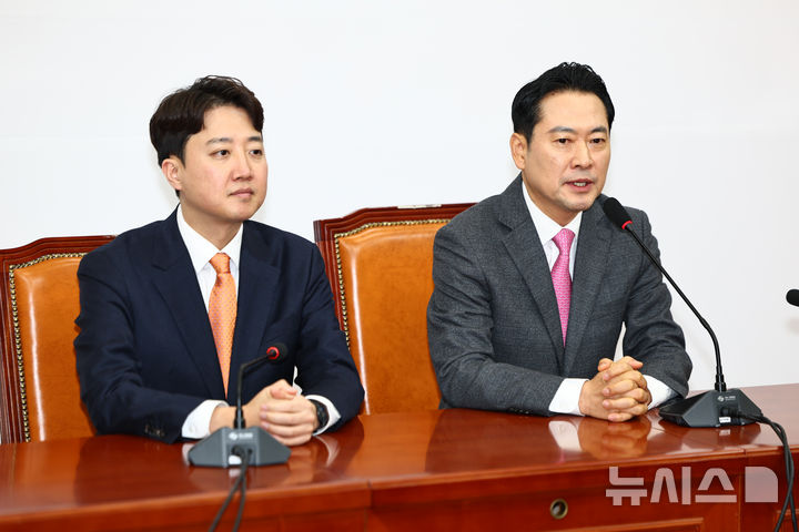 [서울=뉴시스] 김명년 기자 = 장동혁(오른쪽) 국민의힘 대표가 13일 오전 서울 여의도 국회에서 이준석 개혁신당 대표와 만나 발언하고 있다. 2026.01.13. [email protected]