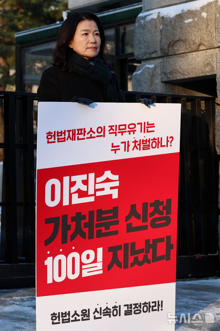 [서울=뉴시스] 이영환 기자 = 이진숙 전 방송통신위원장이 13일 오전 서울 종로구 헌법재판소 앞에서 헌법소원 심판 신속결정을 촉구하며 1인 시위를 하고 있다. 2026.01.13. [email protected]
