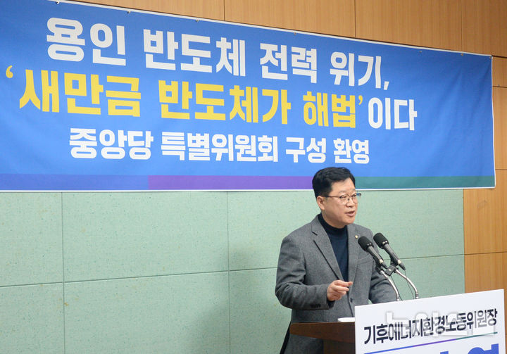 [전주=뉴시스] 김얼 기자 = 더불어민주당 안호영(완주·진안·무주) 국회의원이 13일 전북 전주시 전북특별자치도의회 기자회견장에서 '용인 반도체 삼성전자 이전'과 관련한 기자회견을 열고 질의에 답변하고 있다. 2026.01.13. [email protected]