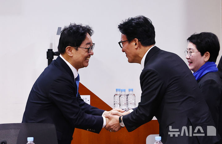 [서울=뉴시스] 김명년 기자 = 김민석 국무총리가 13일 오전 서울 여의도 국회 의원회관에서 열린 민주당 충남-대전 국회의원들과의 간담회에서 박범계 민주당 충청발전특별위원회 공동위원장과 악수하고 있다. 2026.01.13. [email protected]